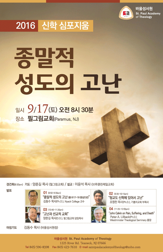 바울성서원에서 주최하는 심포지움이 오는 9월 17일(토요일) 오전 8시 30분에 뉴저지에 있는 필그림교회에서 있습니다.