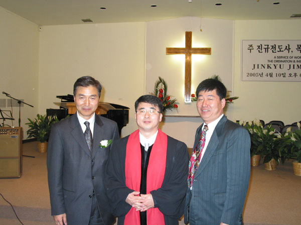 왼쪽이 두란노 서원 뉴욕 대표(당시)이신 김용복 목사님, 중앙이 2005년 4월 10일 목사로 안수 받으신 주진규 목사님